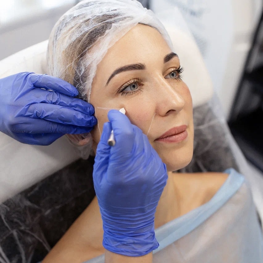 Шаг 2. Далее проводит демакияж и обработку кожи антисептиком, при необходимости — обезболивание зоны с помощью крема с содержанием анестетика.